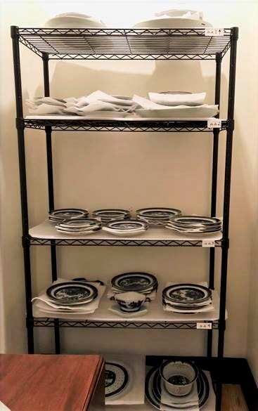 A safe staging area was then created for the plates, and the objects carefully moved from the old shelf to that area. During that time, I noticed that the mismatched objects on the shelf were not cohesive, and that the dinner service was actually scattered throughout a few areas in storage. That doesn’t make sense! I relocated the non-Nanking objects to new locations in collections storage and gathered all 60 pieces of the dining set together.