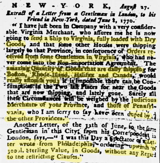 An August report out of New York conveyed the contents of two June letters from gentlemen in London. The first said that an “amazing Quantity of Goods … are daily shipping for Boston, Rhode-Island, Halifax and Canada,” as well as Virginia. The correspondent wrote that “the judicious Merchants of your Province, and those of Pennsylvania, … I am sorry to say have been duped by the other Provinces.” The second author wrote that he had personally seen a Philadelphia order for “upwards of 3000 l. Sterling Value, in Goods, without any Regard to the restricting Clauses.” If Philadelphia was jumping off the boycott bandwagon, gullible New York was being taken for a solo ride.
