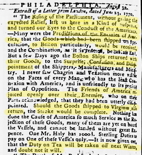 August news from Philadelphia quoted three London letters from June. The first writer said that Parliament’s incomplete reversal on the Townshend Duties “left us here in a Kind of Suspense, and turned our Eyes to the Conduct of the Americans.” Enemies of America predicted that even Bostonians would welcome British imports as the boycott agreement fell apart, but they were shocked when the ships returned with their cargoes still on board. English “Friends of America rejoiced openly over their Enemies” and hoped that Virginia shipments would also be rejected. If Americans only held firm, Parliament would surely repeal the tea tax in the coming winter.