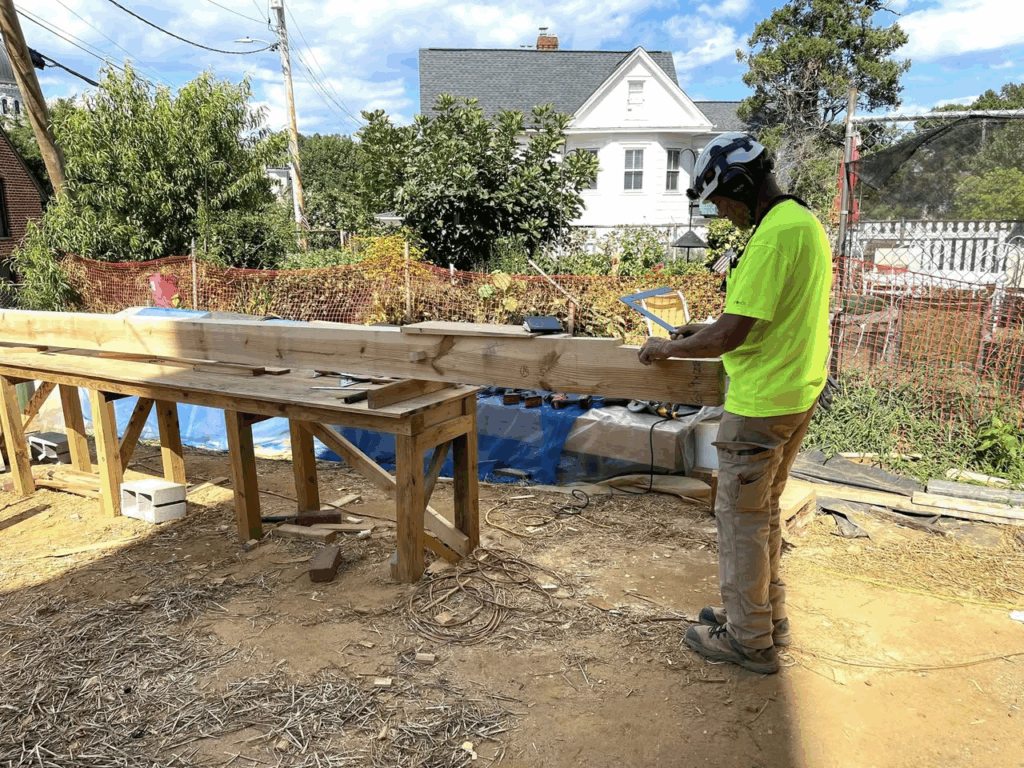 Master carpenter, Steve Chronister, preparing a beam that will supplement new joists being installed at the original location of the second floor of the East wing. The floors were lowered in the early 20th century in order to increase ceiling heights on the second floor from 6 feet 3 inches to 7 feet 6 inches. Formerly the quarters of enslaved persons in the Brice house, the modification was made to accommodate use by the Carvel Hall Hotel and St. John’s College, first for long stay hotel guests and then professors apartments.