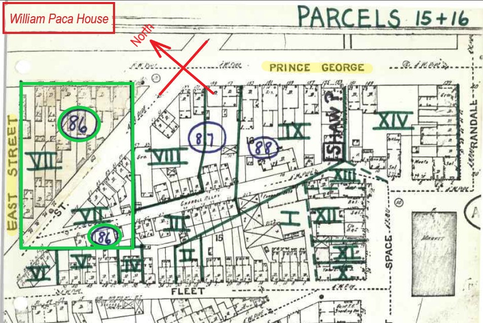 Greentree’s livery stable was on lot 86, opposite Paca’s impressive brick house on lot 93. The curious thing about lot 86 is that it was split diagonally by East Street, with a little more than half on the north side of the street and a little less than half on the south side. The northern wedge was originally surveyed for Annapolis’s first mayor, Amos Garrett, and the southern slice for John Navarre.
