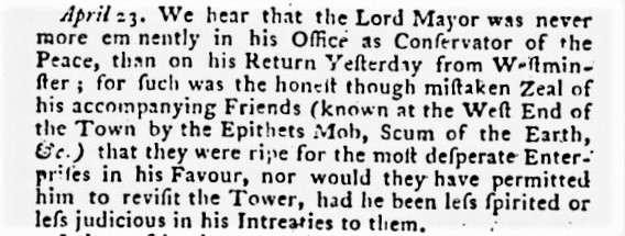 In England, political activists also faced unjust punishments, but those who could inspire and harness popular support most effectively might enjoy some level of protection from the worst official reprisals. Brass Crosby, Lord Mayor of London in 1770-71, was one such savvy politician, winning the loyalty of many Londoners by refusing to allow Royal Navy press gangs to round up townsmen for involuntary service at sea. When Crosby upset the House of Commons by failing to punish a printer who published unauthorized reports of Parliamentary proceedings, common Londoners came to his aid. Although the Lord Mayor was committed to the Tower of London for a time, Crosby eventually avoided the clutches of his Westminster foes largely thanks to the “Zeal of his accompanying Friends (known at the West End of the Town by the Epithets Mob, Scum of the Earth, &c.).” It sometimes helped having lots of friends in low places.