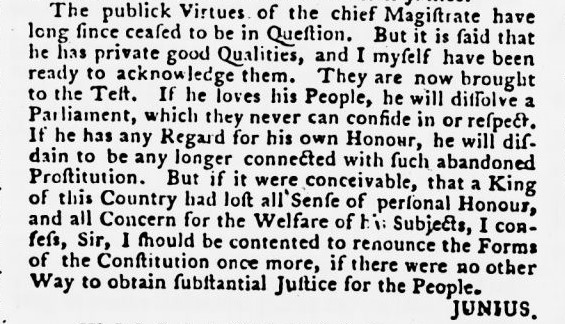 The complete “Junius” letter printed by Mrs. Green on July 4, 1771 takes up almost three full newspaper columns, but the concluding paragraph drives home its argument: George III is responsible for the conduct of his government, and a truly virtuous and honorable king would not stand for the “abandoned Prostitution” of a corrupt Parliament. No wonder “Junius” (whose true identity is still unconfirmed 250 years later) found enthusiastic readers in America.