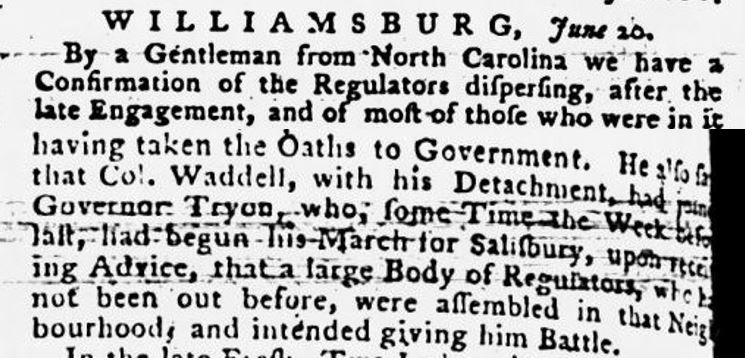 News out of Williamsburg reported on the aftermath of a recent fight in North Carolina between Governor William Tryon and western backcountry settlers who felt exploited by the colony’s eastern elites. These so-called Regulators were routed by Tryon’s militiamen at the May 16, 1771 Battle of Alamance, which some historians have characterized as a precursor to the coming battles of the Revolutionary War and the deep divisions between future American patriots and loyalists. (As an aside, fans of Outlander will recognize the Battle of Alamance as a pivotal event in the fifth book and TV series).