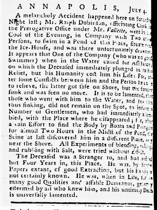 The week’s Annapolis news article was about a tragic accidental drowning. Ralph Dobinson, clerk of the Prerogative Office under Elie Vallete’s direction, went swimming with two others “in the Cool of the Evening.” One member of the group wasn’t a good swimmer and called for help from the pond. Dobinson jumped in, the two struggled, but only one of them emerged safely from the water. After a search of almost two hours, Dobinson’s lifeless body was discovered near the shore. Bleeding and rubbing with salt failed to revive him. Although not much was known of his background, Ralph Dobinson was kindly remembered for his “many good Qualities and affable Demeanor,…and his untimely Death is universally lamented.”
