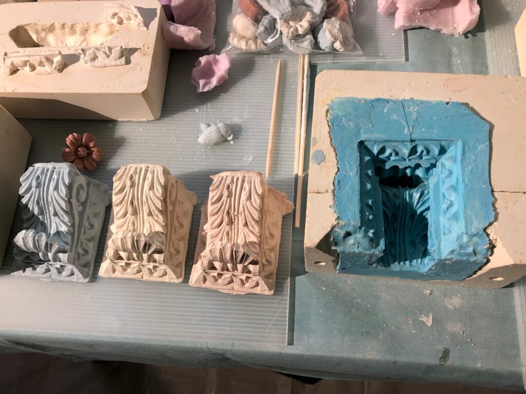 In the Parlor, Chris reports that the rosettes and medallions are different from the rest of the cornice material, and that the limewash there did not bond completely to the substrate, and these surfaces are far more fragile. The rest of the cornice still has some of the limewash layers that have carbonated to a very hard crust and are well attached to the substrate. Here’s Kelsey, sharing a bit about the challenges of working on the Parlor cornice: