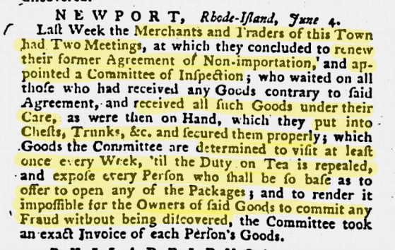 In Newport, the “Merchants and Traders of this Town had Two Meetings” at which they renewed their boycott agreement and appointed a Committee of Inspection to carefully inventory and properly secure any goods which had already been received “contrary to said Agreement.” The Committee would check on the impounded goods “at least once every Week, ’til the Duty on Tea is repealed, and expose every Person who shall be so base as to offer to open any of the Packages; and to render it impossible for the Owners of said Goods to commit any Fraud without being discovered.”