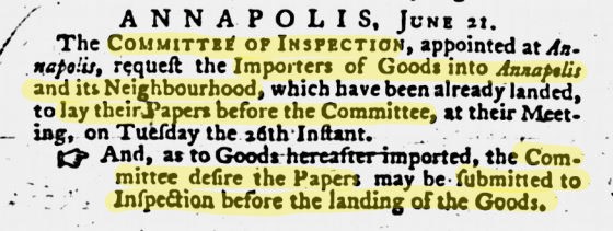Newport was clamping down, and Annapolis patriots were determined to do the same. The local Committee of Inspection called a June 26th meeting and instructed “the Importers of Goods into Annapolis and its Neighborhood, which have already landed, to lay their Papers before the Committee.” In the future, papers should be “submitted to Inspection before the landing of the Goods.”