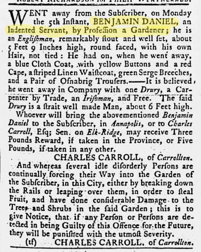 The June 28, 1770 issue of the Maryland Gazette contains 14 such notices describing 26 runaways. Twenty-one were indentured or convict servants, four were enslaved, and one was a free black man who had indentured himself for five years in payment for “Cure of a Pox.” I’m not posting clippings of all of the ads (you can read them for yourself starting here), but I do want to recognize by name each of these individuals who took decisive action in pursuit of their own freedom 250 years ago: