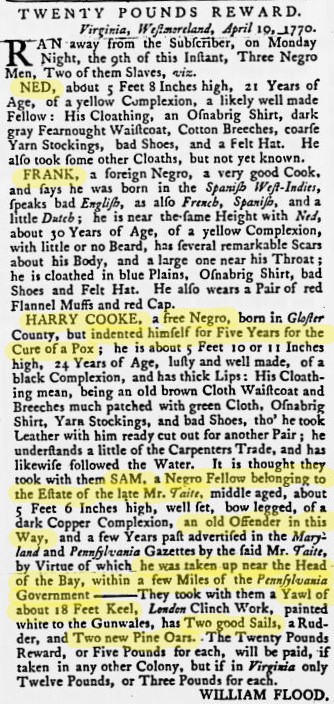 Such is the case with the last of four men listed in the above ad. William Flood tells us that “SAM, a Negro Fellow belonging to the Estate of the late Mr. Taite” escaped with three other men in April 1770, and that Sam was “an old Offender in this Way,” having run off once before a few years earlier. Captured “up near the Head of the Bay, within a few miles of the Pennsylvania Government,” Sam was returned to Taite’s control in Westmoreland, Virginia and, most likely, punished severely for his transgression. Yet Sam was unbroken and obviously willing to take the risk of running away again, this time with the aid of three companions and an 18-foot yawl with “Two good Sails” and “Two new Pine Oars.”