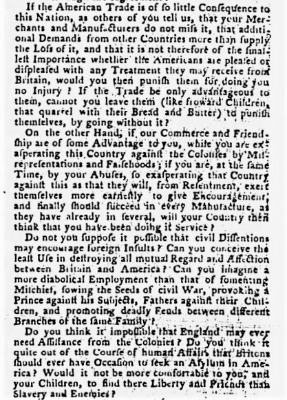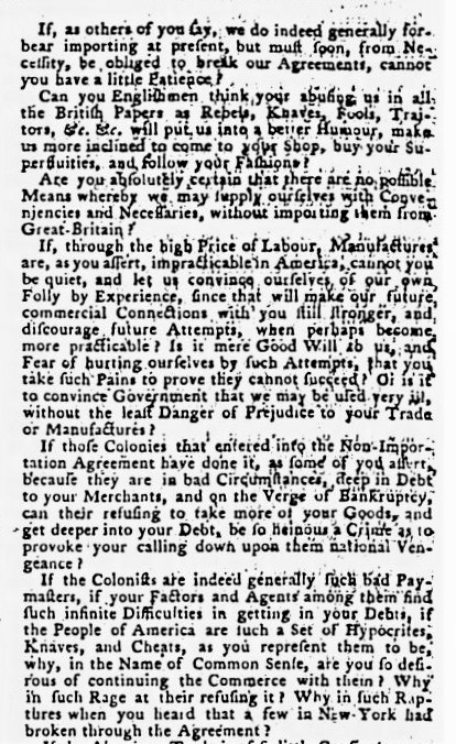 1. If some of you Englishmen say that we Americans don’t observe our own nonimportation agreements but instead secretly import and use British goods, then why are you so angry with us and why do you propose compelling us to trade by force?