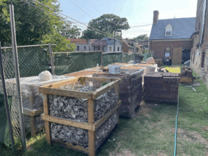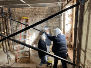 The restoration of the James Brice House continues to move forward with steady, detailed progress. June brought significant activity in several areas of the project, including structural stabilization, hands-on conservation